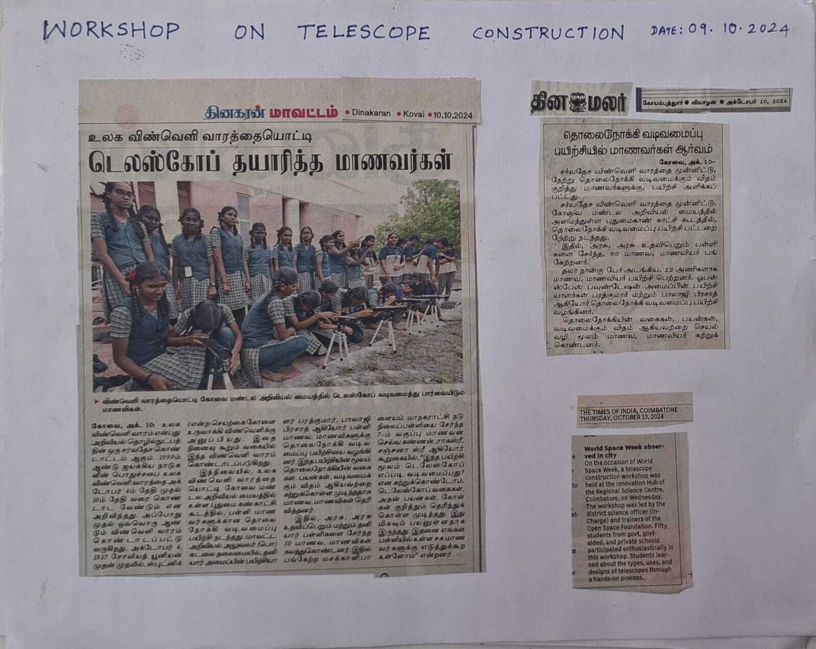 WORKSHOP ON TELESCOPE CONSTRUCTION CONDUCTED AT INNOVATION HUB OF REGIONAL SCIENCE CENTRE , COIMBATORE ON 09.10.2024