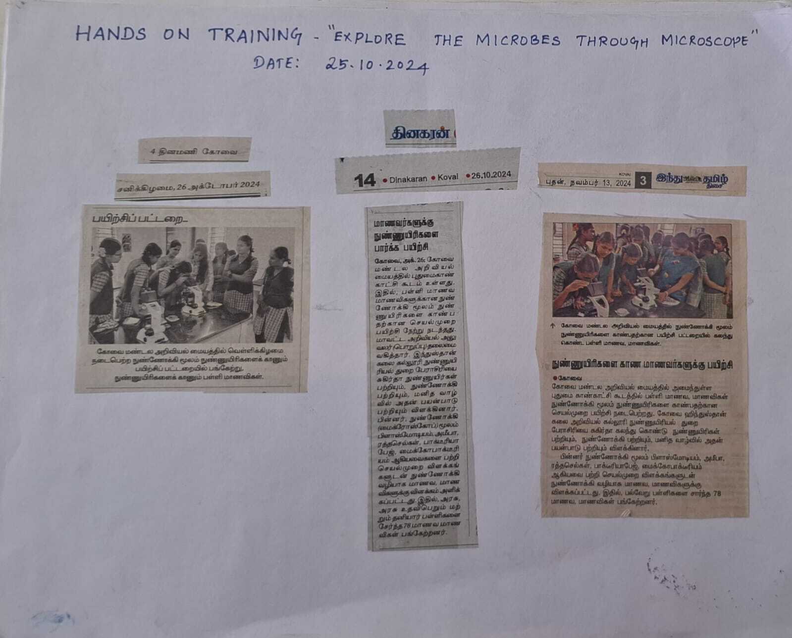 HANDS ON TRAINING ON EXPLORE THE MICROBES THROUGH MICROSCOPE CONDUCTED AT INNOVATION HUB OF REGIONAL SCIENCE CENTRE ,COIMBATORE ON 25.10.2024.