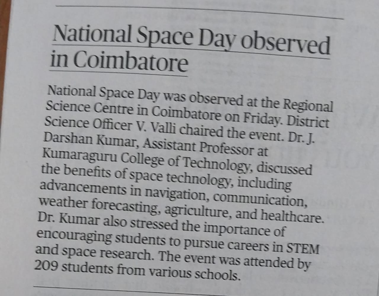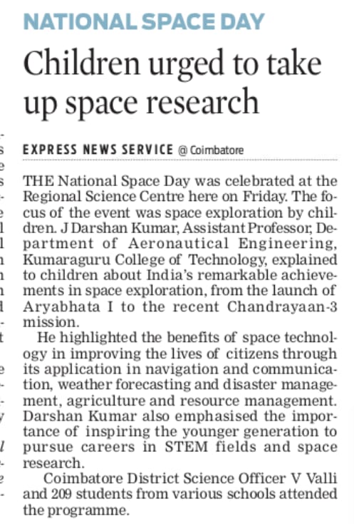 NATIONAL SPACE DAY WAS CELEBRATED AT REGIONAL SCIENCE CENTRE, COIMBATORE ON 23.08.2024